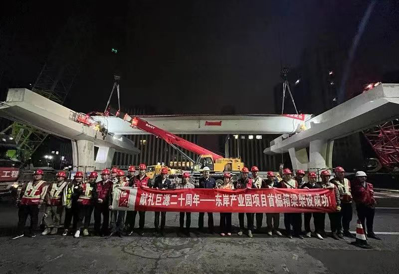5月26日晚22時58分,集團承建的東岸產業園區基礎設施綜合改造項目開始首榀預制箱梁架設,27日凌晨4時45分5片箱梁架設圓滿完成,成功為集團成立二十周年獻禮。距離項目開工僅4個月,項目建設再次“換擋提速”,正式進入橋梁上部結構施工。
